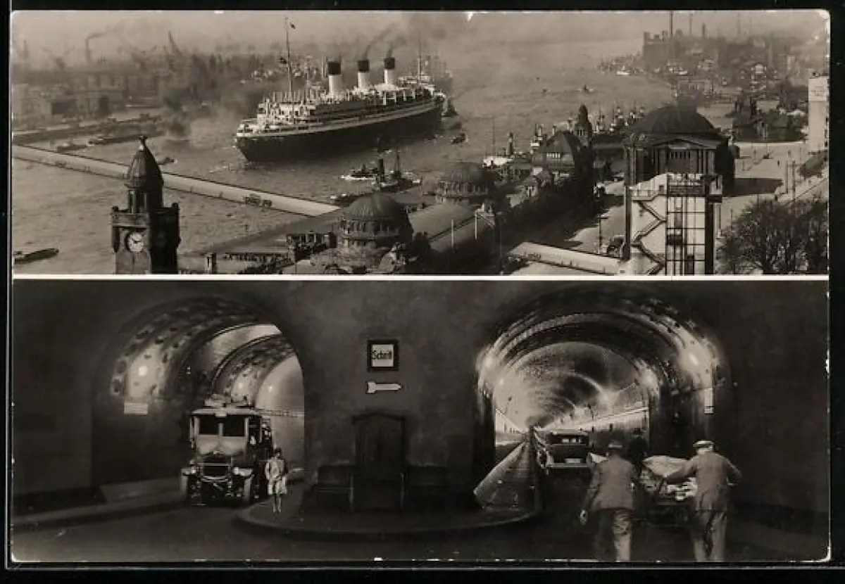 AK Hamburg-St. Pauli, Elbtunnel, Aussenansicht u. Inneres mit Automobilen