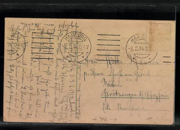 Personenbezogene Daten auf der Rückseite der Karte wurden durch blauen Textmarker unkenntlich gemacht. Die blauen Stellen sind auf die Vorderseite durchgeweicht und wirken sich negativ auf das Postkartenfoto aus