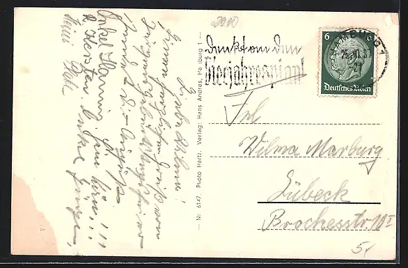alte Ansichtskarte, gelaufen 1937, rückseitig Oberflächenschaden, Einriss unten re.
