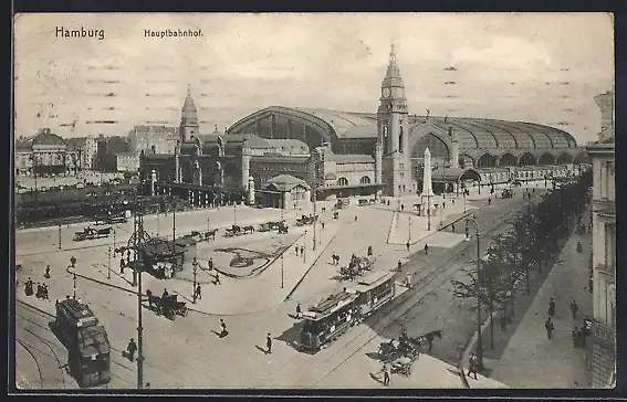 AK Hamburg-St.Georg, Partie am Hauptbahnhof, Strassenbahn, Pferdekutschen, Obelisk