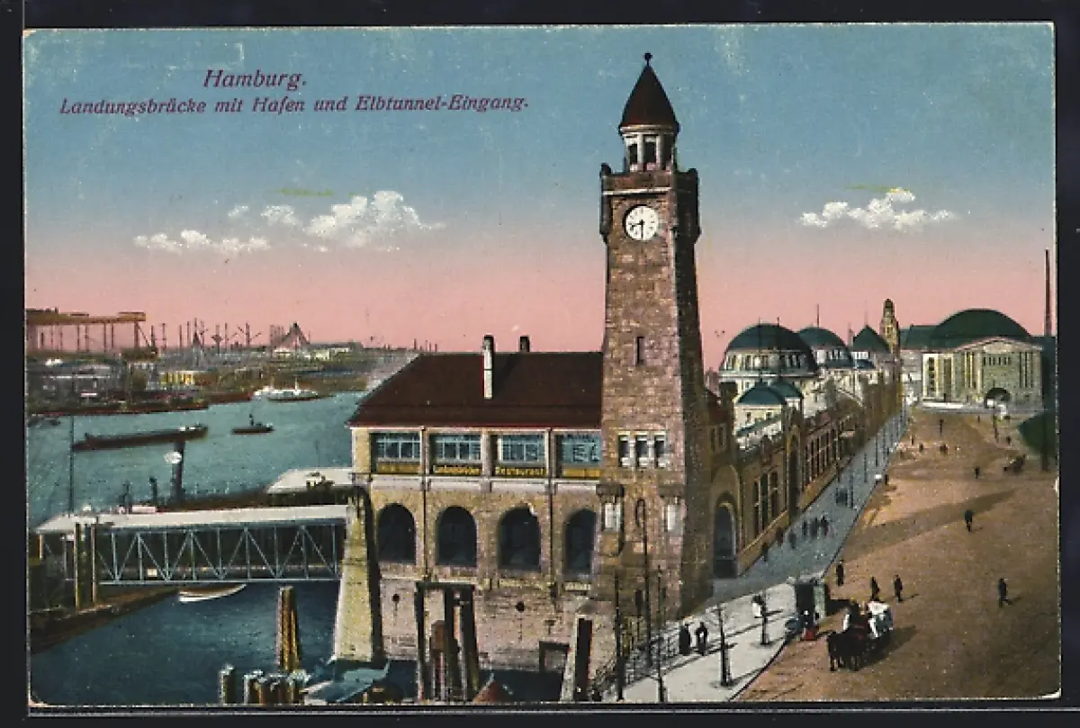 AK Hamburg-St.Pauli, Landungsbrücke mit Hafen und Elbtunnel-Eingang