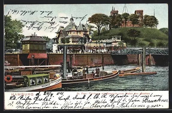 AK Hamburg-St.Pauli, St. Pauli Fährhaus mit Seewarte, Segelboot Kosmos, Dampfschiff Baschy & Cz