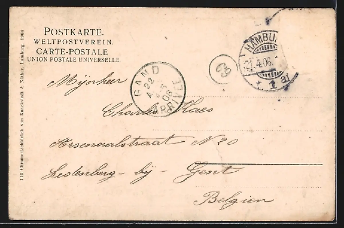 alte Ansichtskarte, gelaufen 1906, Briefmarke entfernt, rückseitig Oberflächenschaden, guter Zustand