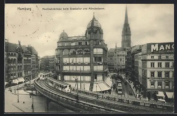 AK Hamburg, Strassenbahn und Hochbahnbrücke beim Graskeller und Mönckedamm