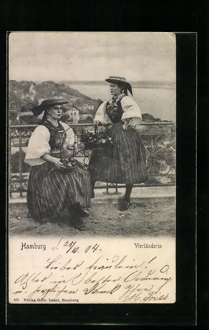 AK Hamburg, Zwei Vierländerinnen in Tracht bieten Obst feil
