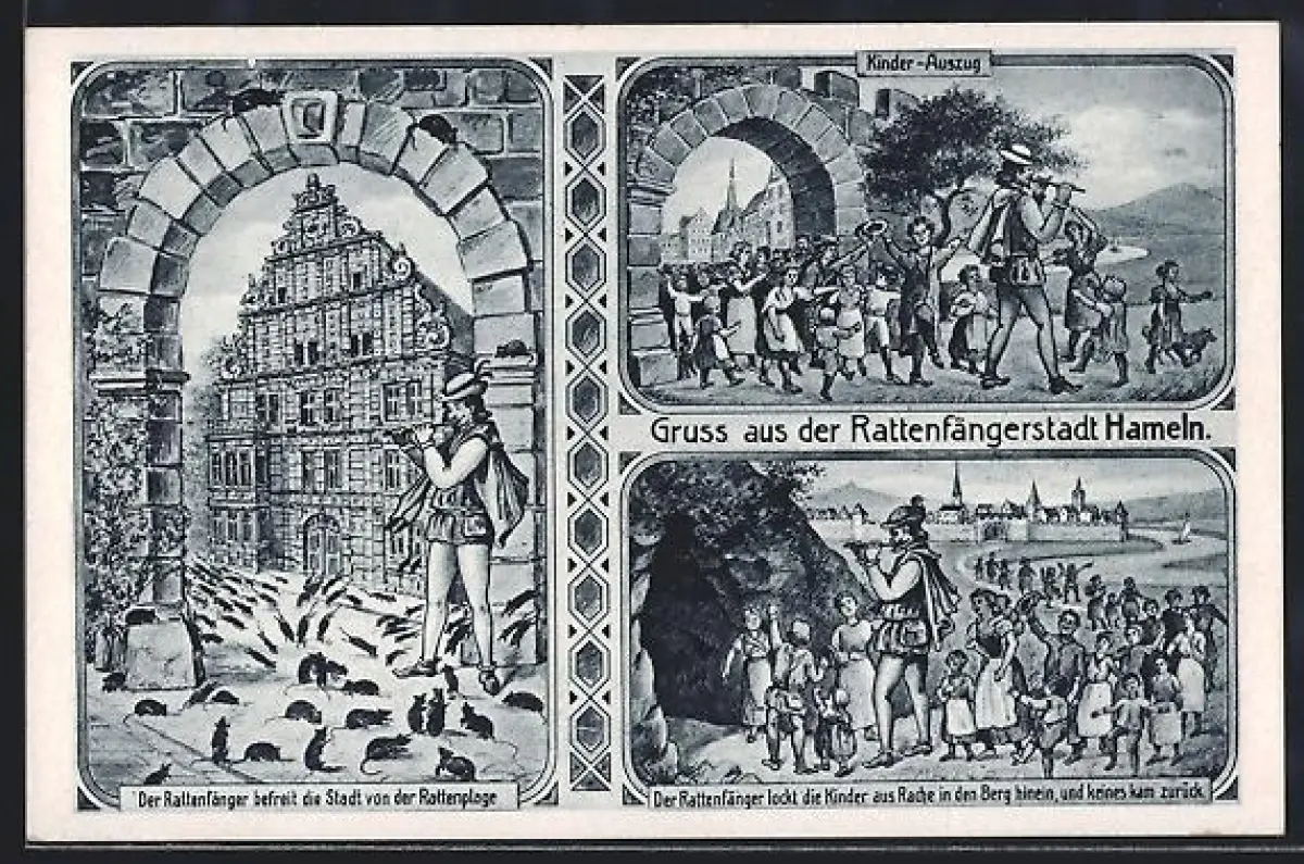 AK Hameln, Befreiung der Stadt von der Rattenplage, Kinder-Auszug, Der Rattenfänger lockt die Kinder in den Berg hinein