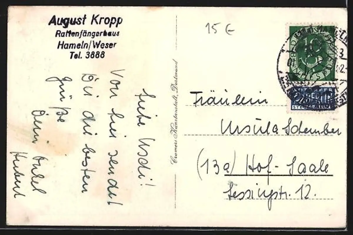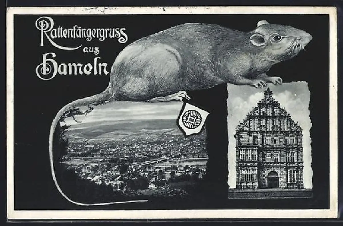 AK Hameln, Gesamtansicht, Rattenfängerhaus und grosse Ratte, Rattenfängergruss