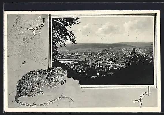 AK Hameln, Gesamtansicht aus der Ferne, Passepartout mit Ratte, die die Ansicht frisst