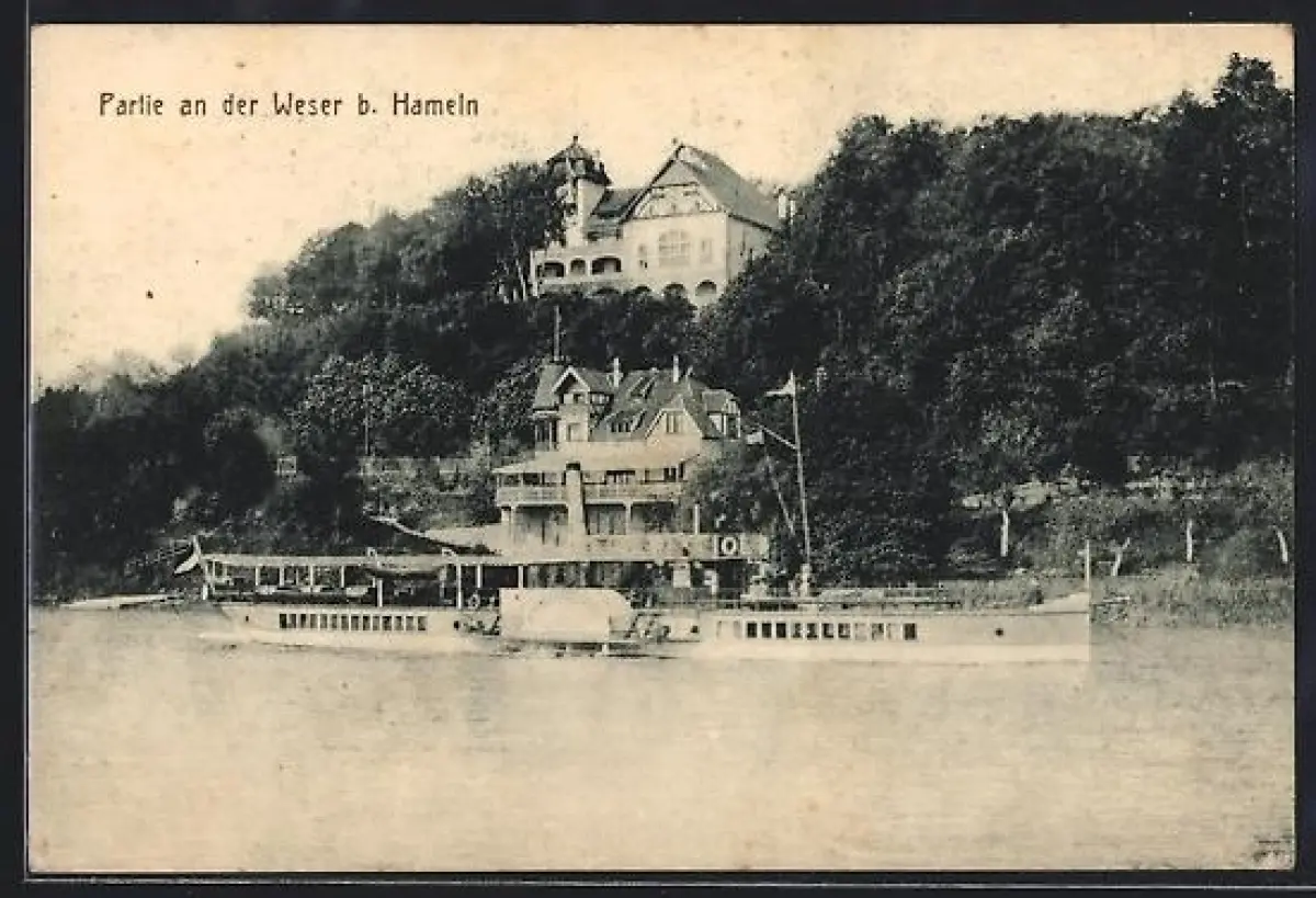 AK Hameln /Weser, Uferpartie mit Dampfer