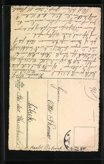 Personenbezogene Daten auf der Rückseite der Karte wurden durch blauen Textmarker unkenntlich gemacht. Die blauen Stellen sind auf die Vorderseite durchgeweicht und wirken sich negativ auf das Postkartenfoto aus