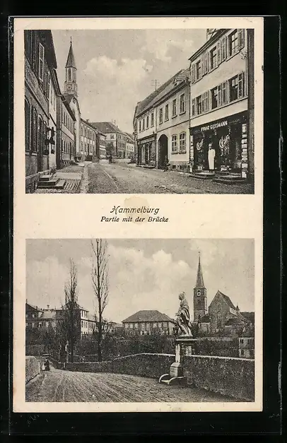AK Hammelburg, Strassenpartie mit Café Gossmann, Partie an der Brücke