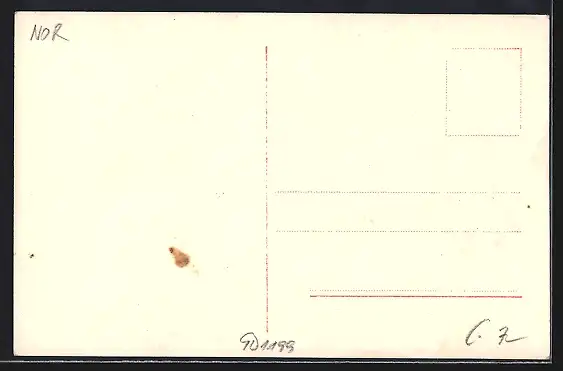 Personenbezogene Daten auf der Rückseite der Karte wurden durch blauen Textmarker unkenntlich gemacht. Die blauen Stellen sind auf die Vorderseite durchgeweicht und wirken sich negativ auf das Postkartenfoto aus