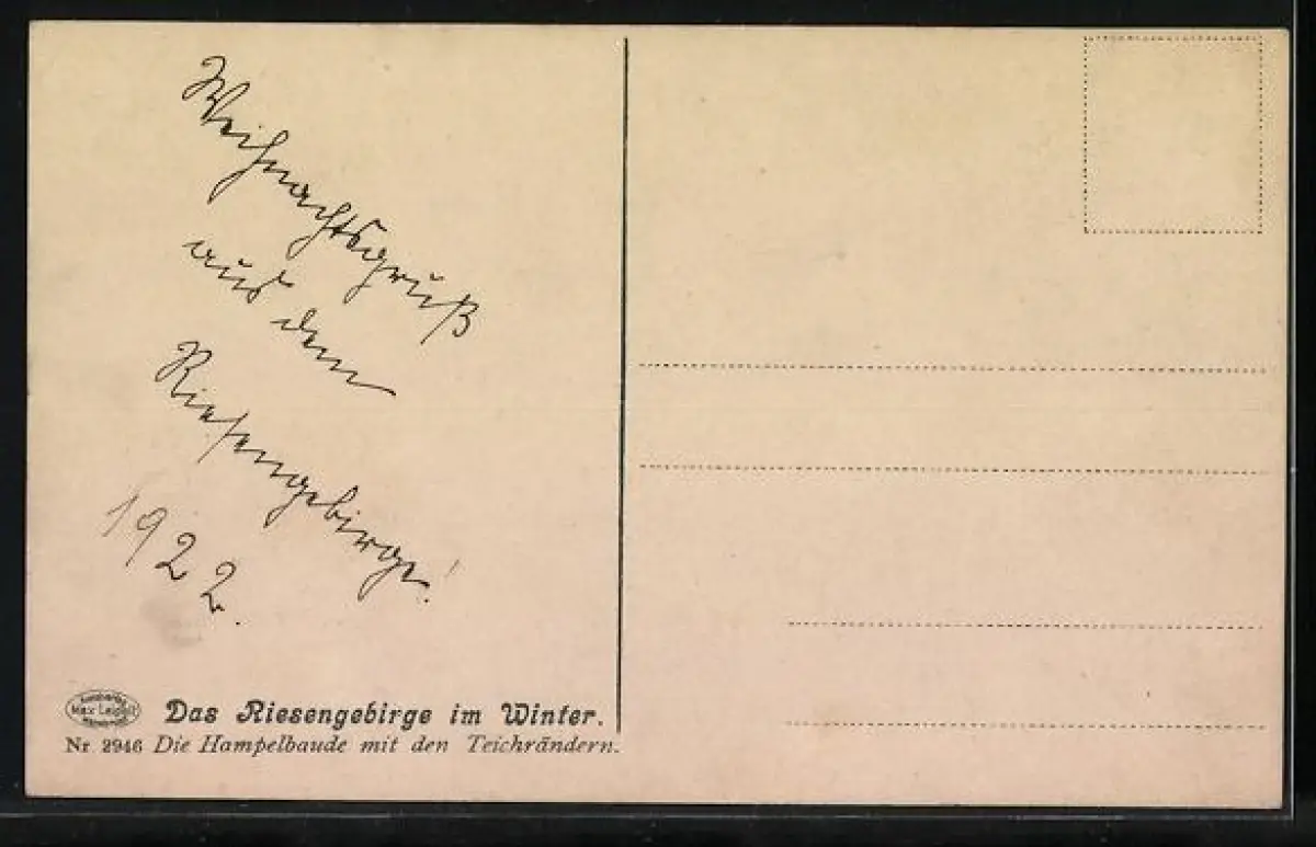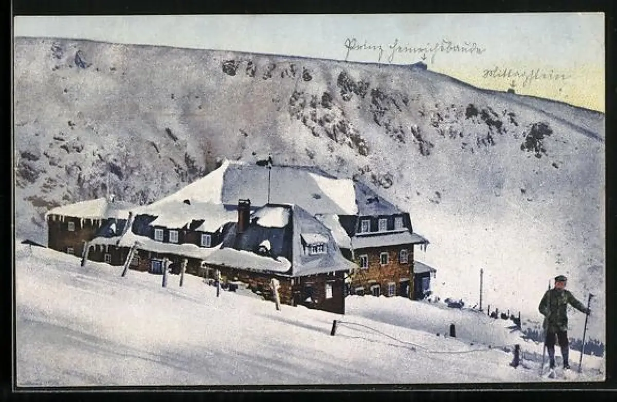 AK Hampelbaude, Berghütte mit den Teichrändern im Schnee, Riesengebirge