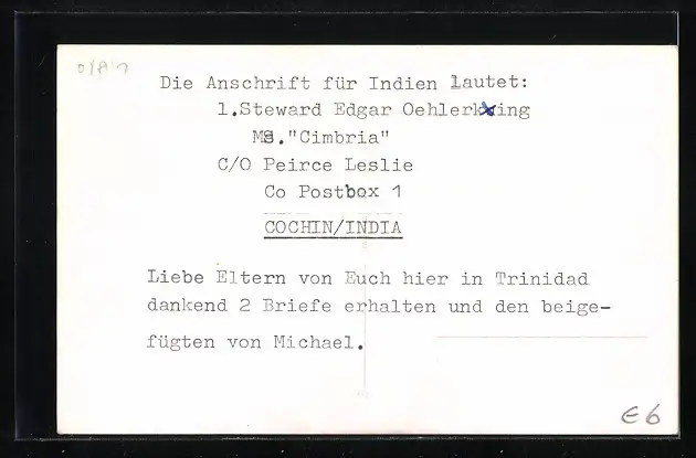Personenbezogene Daten auf der Rückseite der Karte wurden durch blauen Textmarker unkenntlich gemacht. Die blauen Stellen sind auf die Vorderseite durchgeweicht und wirken sich negativ auf das Postkartenfoto aus