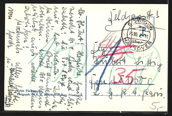 Personenbezogene Daten auf der Rückseite der Karte wurden durch blauen Textmarker unkenntlich gemacht. Die blauen Stellen sind auf die Vorderseite durchgeweicht und wirken sich negativ auf das Postkartenfoto aus
