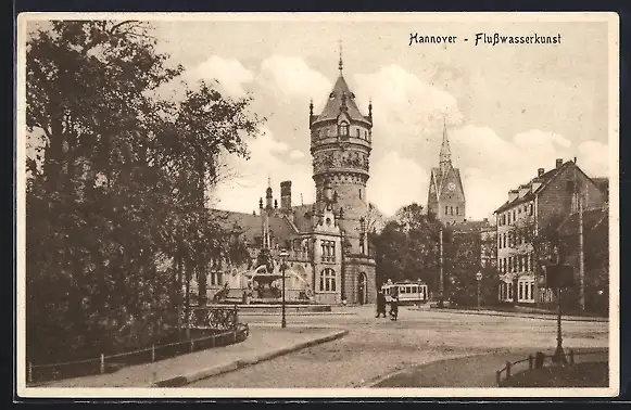 AK Hannover, Flusswasserkunst mit Strassenbahn
