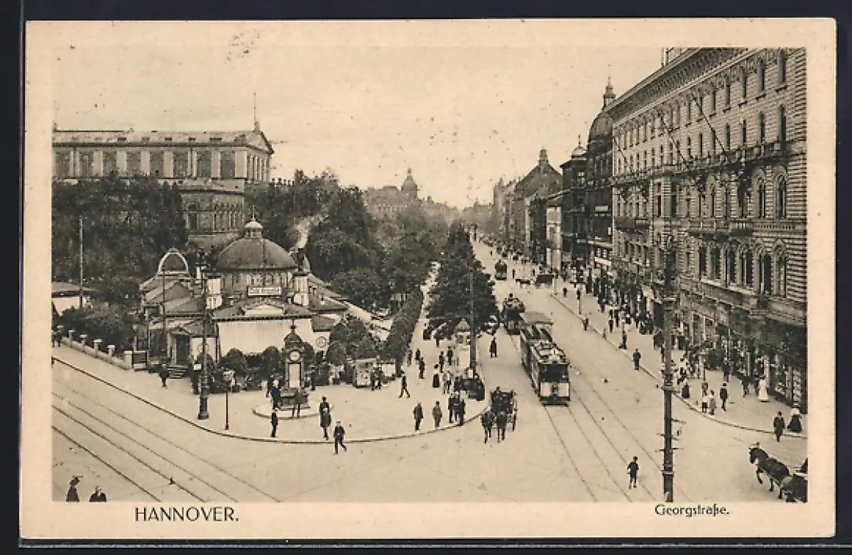 AK Hannover, Georgstrasse mit Cafe Kröpcke u. Strassenbahn, Ansicht aus der Vogelschau