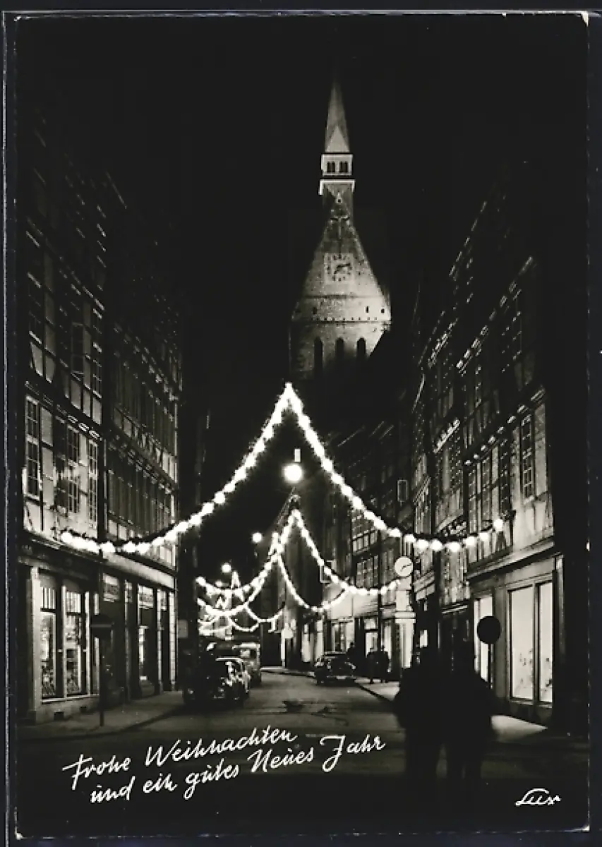 AK Hannover, Kramergasse mit Marktkirche, Weihnachtsbeleuchtung