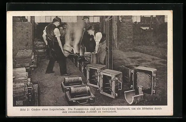 AK Hannover-Linden, Hanomag, Werdegang eines Achslagers, Fabrikarbeiter beim Giessen einer Lagerschale