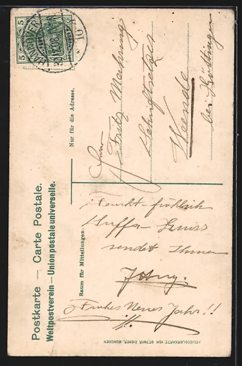 alte Ansichtskarte, gelaufen 1908, Eckknicke oben links und unten rechts, guter Zustand