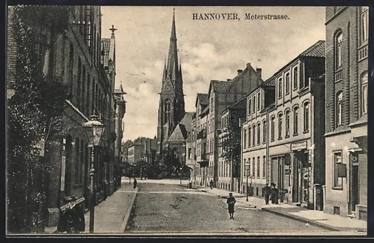 AK Hannover, Meterstrasse mit Blick zur Kirche