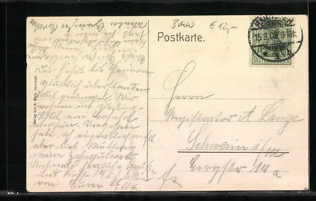 alte Ansichtskarte, gelaufen 1908, Abriebspuren oben re., guter Zustand