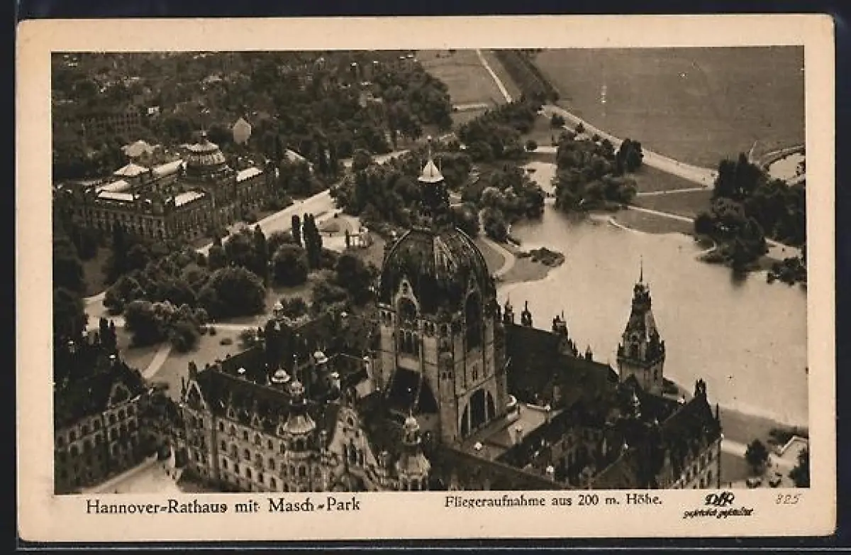AK Hannover, Vogelschau auf Rathaus mit Masch-Park