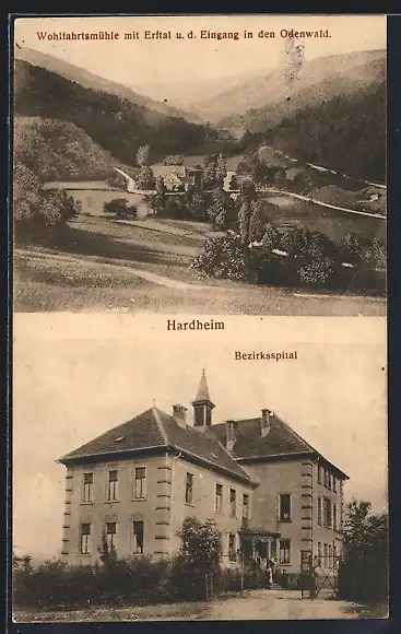 AK Hardheim, Wohlfahrtsmühle mit Erftal u. d. Eingang in den Ostenwald, Bezirksspital