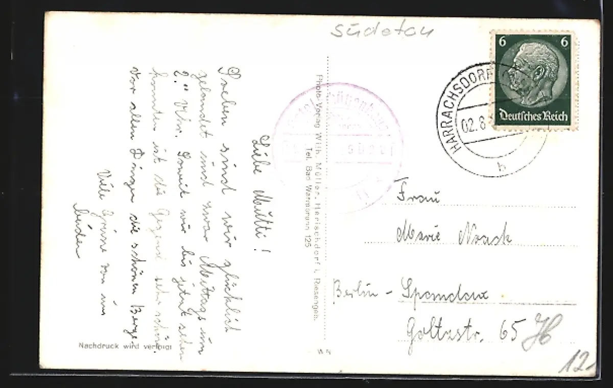 Personenbezogene Daten auf der Rückseite der Karte wurden durch blauen Textmarker unkenntlich gemacht. Die blauen Stellen sind auf die Vorderseite durchgeweicht und wirken sich negativ auf das Postkartenfoto aus