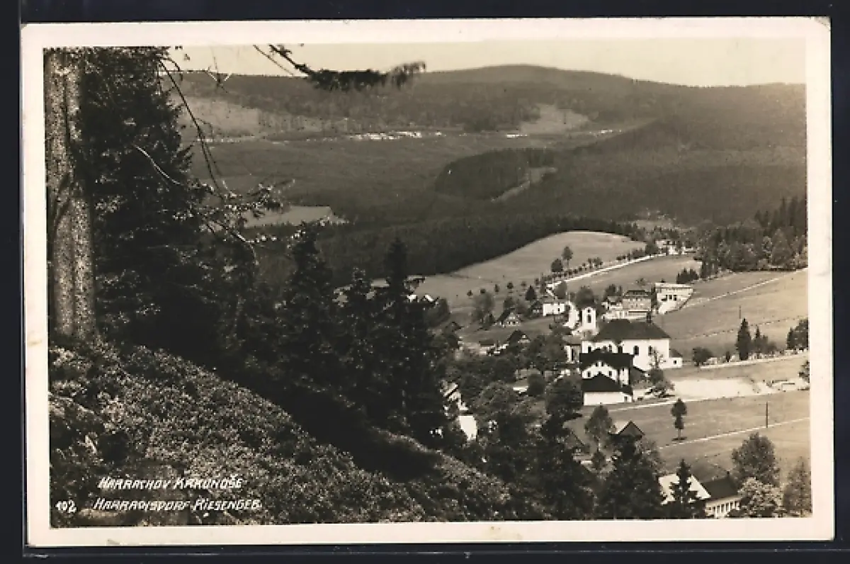 AK Harrachsdorf im Riesengebirge, Teilansicht mit Kirche aus der Vogelschau