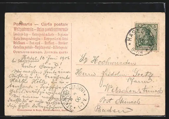 gelaufen 1906, Eckknicke li. oben u. re. unten, guter Zustand