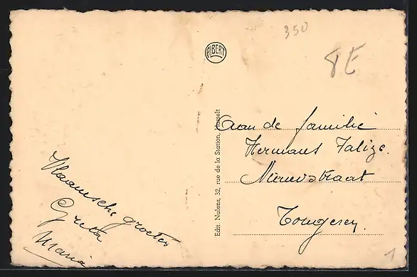 Personenbezogene Daten auf der Rückseite der Karte wurden durch blauen Textmarker unkenntlich gemacht. Die blauen Stellen sind auf die Vorderseite durchgeweicht und wirken sich negativ auf das Postkartenfoto aus