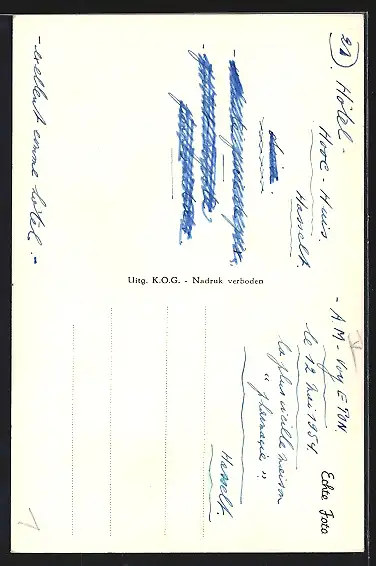 Personenbezogene Daten auf der Rückseite der Karte wurden durch blauen Textmarker unkenntlich gemacht. Die blauen Stellen sind auf die Vorderseite durchgeweicht und wirken sich negativ auf das Postkartenfoto aus