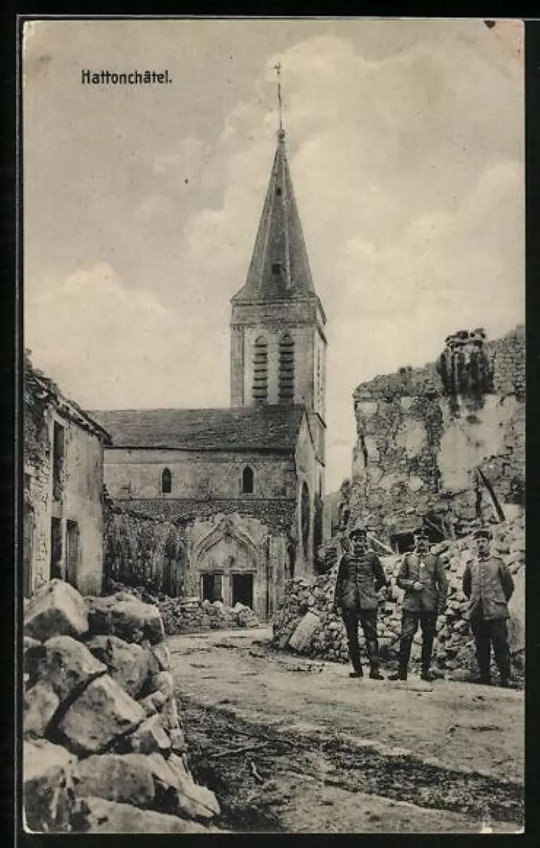 AK Hattonchatel, Drei Soldaten in Ruinen bei der Kirche