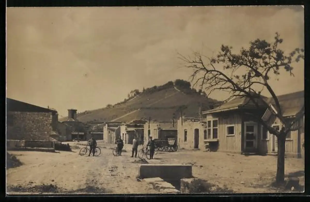AK Hattonville, Vue du village avec colline en arrière-plan et habitants avec vélos