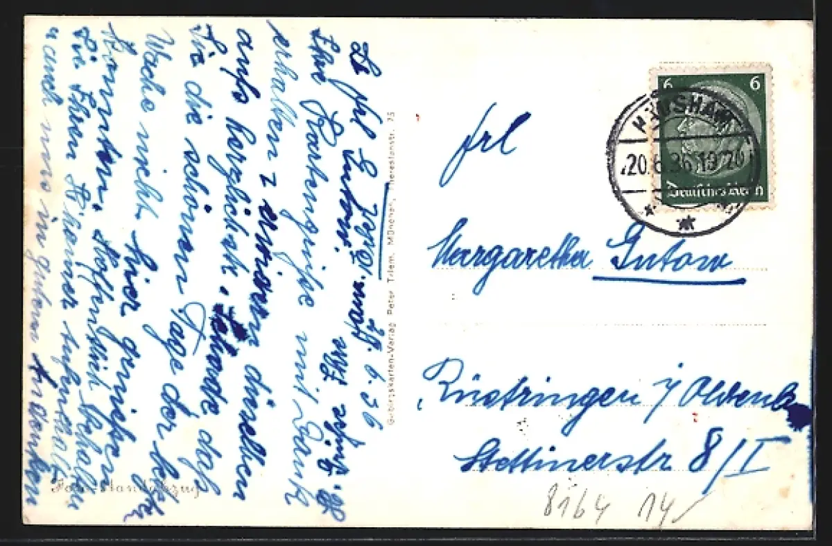 Personenbezogene Daten auf der Rückseite der Karte wurden durch blauen Textmarker unkenntlich gemacht. Die blauen Stellen sind auf die Vorderseite durchgeweicht und wirken sich negativ auf das Postkartenfoto aus