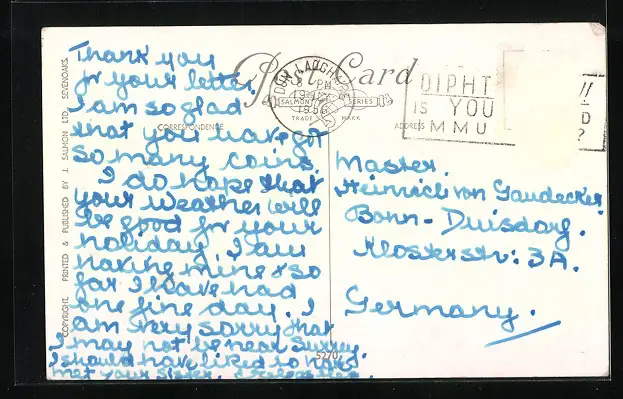 Personenbezogene Daten auf der Rückseite der Karte wurden durch blauen Textmarker unkenntlich gemacht. Die blauen Stellen sind auf die Vorderseite durchgeweicht und wirken sich negativ auf das Postkartenfoto aus