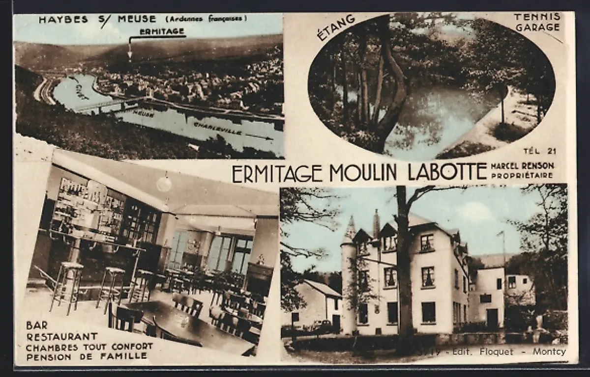 AK Haybes s. Meuse, Ermitage Moulin Labotte avec vue, étang et intérieur du bar-restaurant