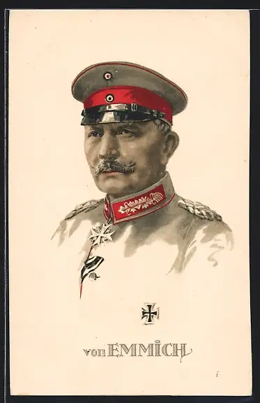 AK Heerführer von Emmich in Uniform, AK-Reklame Hermann Schött AG Rheydt