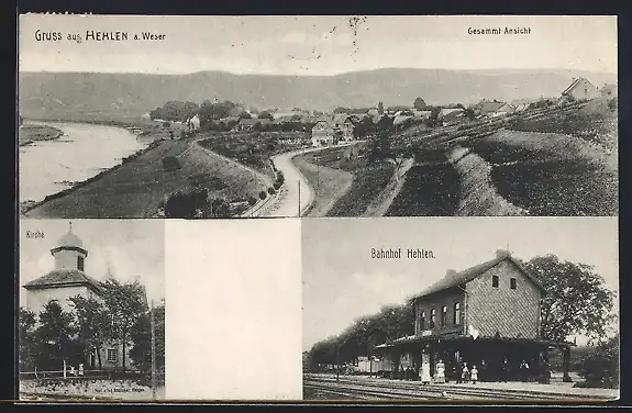 AK Hehlen a. Weser, Gesamtansicht, Bahnhof & Kirche