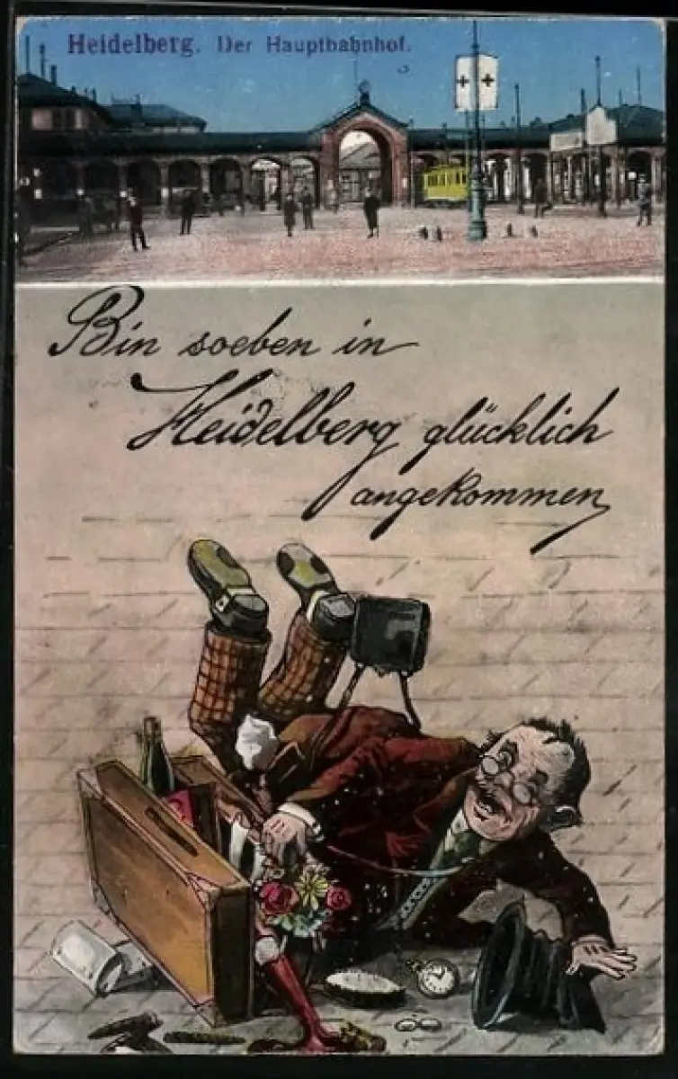 AK Heidelberg, Hauptbahnhof mit Strassenbahn, Mann mit Koffer ist ausgerutscht