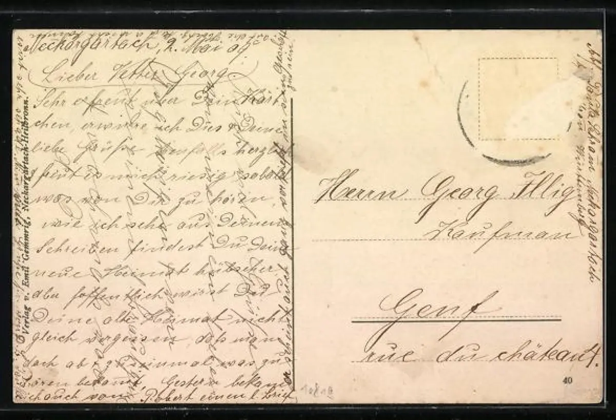 alte Ansichtskarte, gelaufen, Briefmarke entfernt, rückseitig Oberflächenschaden, guter Zustand