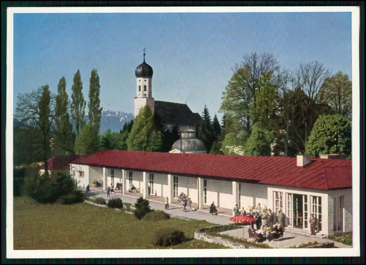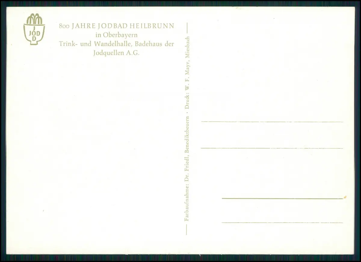 Heilbrunn (Oberbayern) – Ansicht der Trink- und Wandelhalle mit Badehaus der Jodquellen A.G., im Hintergrund die charakteristische Kirche mit Zwiebelturm und Alpenkulisse. Farbaufnahme von Dr. Friedl, Benediktbeuern, Druck W. F. Mayr, Miesbach. Anlass: 800 Jahre Jodbad Heilbrunn.