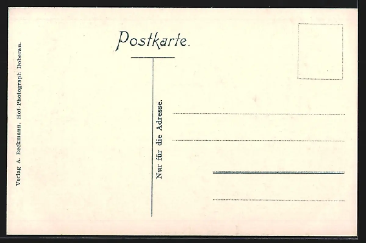 Personenbezogene Daten auf der Rückseite der Karte wurden durch blauen Textmarker unkenntlich gemacht. Die blauen Stellen sind auf die Vorderseite durchgeweicht und wirken sich negativ auf das Postkartenfoto aus