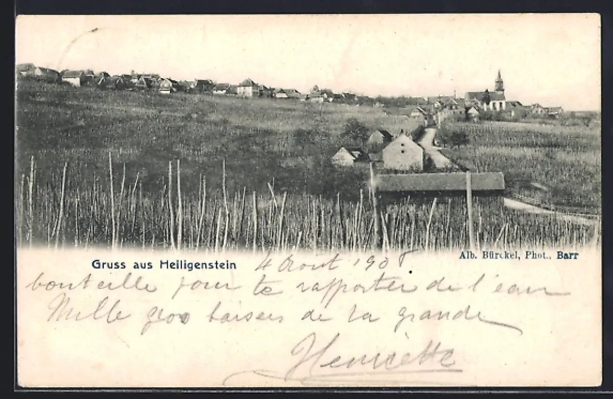 AK Heiligenstein, Ortsansicht mit Kirche und Feldern