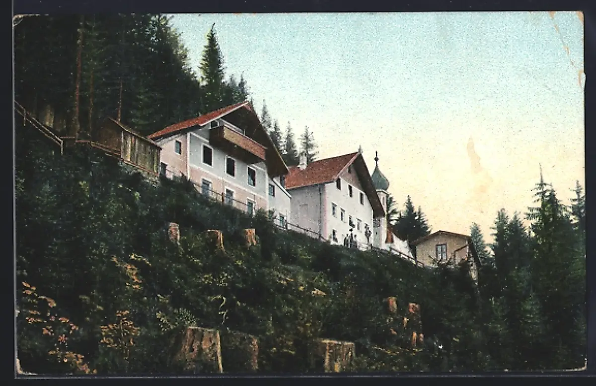 AK Heiligwasser bei Igls, Wohnhäuser auf Anhöhe mit Baumstümpfen