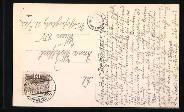 Personenbezogene Daten auf der Rückseite der Karte wurden durch blauen Textmarker unkenntlich gemacht. Die blauen Stellen sind auf die Vorderseite durchgeweicht und wirken sich negativ auf das Postkartenfoto aus