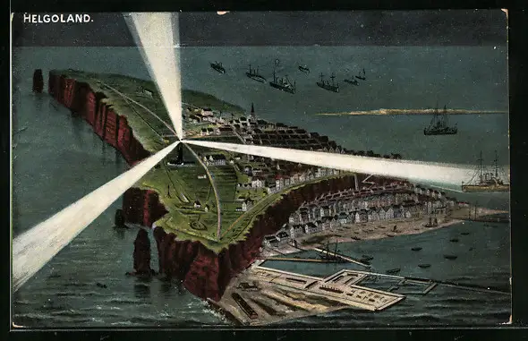 AK Helgoland, Inselpanorama mit Leuchtturm bei Nacht
