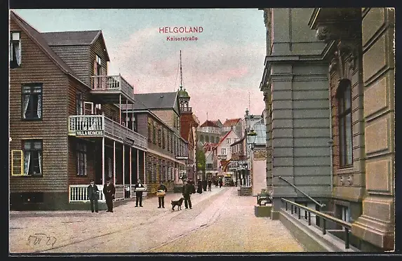 AK Helgoland, Partie in der Kaiserstrasse, mit Dienstmännern und Bauchladen-Verkäufern