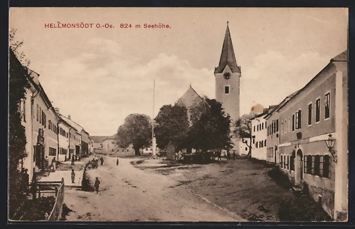 AK Hellmonsödt /O.-Oe., Strassenpartie mit Kirche
